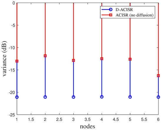 The variance of frequency estimation both D-ACISR and ACISR algorithms with dB, , and .