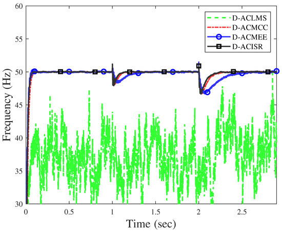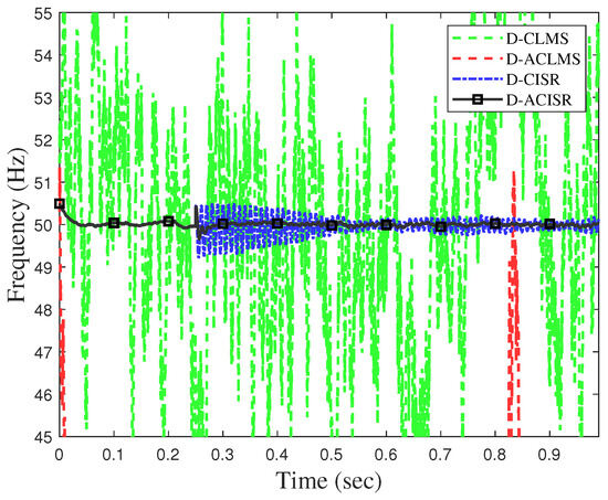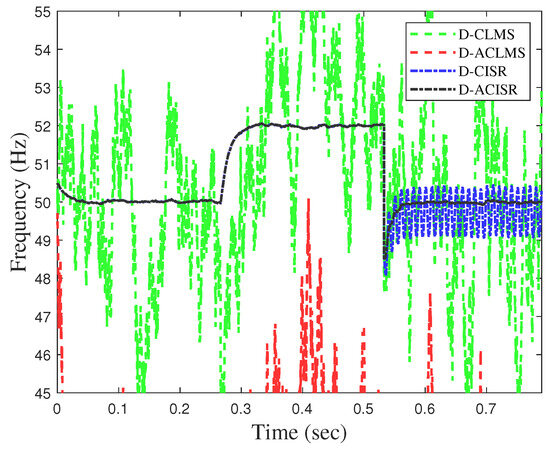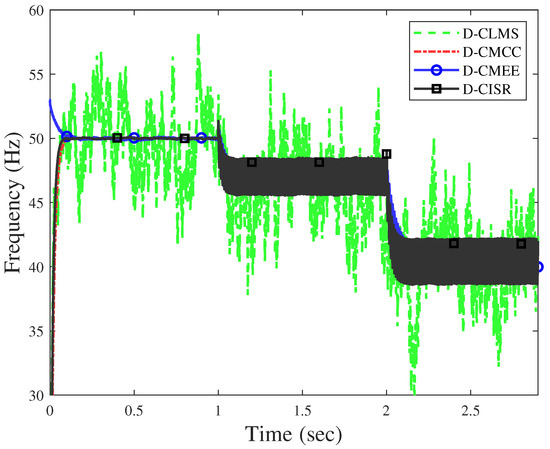 In order to have fair competition, the step sizes of all algorithms are set as , and the sliding data are set as for the D-CMEE algorithm. From the above figures, the conventional D-CLMS and D-ACLMS algorithms suffer from the characteristics of impulsive noises. When the voltage sag happens, the proposed D-ACISR algorithm can track the system frequency accurately. However, the proposed D-CISR algorithm with the SL model cannot track the system frequency after a noticeable dip in voltage amplitude. Subsequently, the D-CMEE, D-ACMEE, and proposed algorithms exhibit comparable convergence rates (all approximately 0.1 s), but the rate of convergence of D-ACMEE algorithm becomes slower and slower when the faults of the system occur. In contrast, the D-CMCC and D-ACMCC algorithms require a significantly longer duration to accurately track the target. Moreover, the tracking performance of the D-ACMEE algorithm is weak after 1 s. Under the Gaussian noise, the proposed algorithms have the same robustness as the existing algorithms.