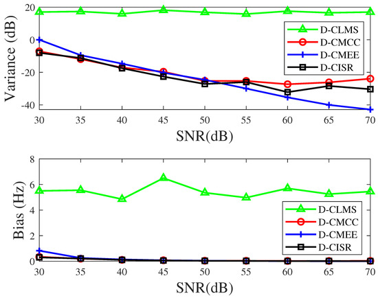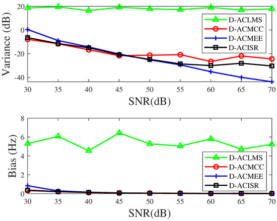 As shown in Figure 8, the variances of all algorithms with the WL model diminish with a growing SNR. For the same convergence rate, the step sizes of the D-ACISR, D-ACLMS, and D-ACMCC algorithms are set as 0.01, and the step size of the D-ACMEE algorithm is 0.02. As we can see, the proposed D-ACISR algorithm obtains about 30 dB for high-level SNR, which is lower than that of the D-ACMCC algorithm, and higher than that of the D-ACMEE algorithm. When the voltage of the three-phase system does not drop, the links of variance and bias in Figure 9 are similar to that of Figure 8. The variance of the proposed D-CISR algorithm also achieves 30 dB for a high SNR, which is better than the D-CMCC algorithm, but worse than the D-CMEE algorithm. However, the non-Gaussian noise degrades the performances of D-ACLMS and D-CLMS algorithms, making them have a large bias.