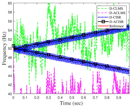 In the second case, the system frequency of 50 Hz, suffered from the Type C voltage rise (), and rises and decays at a rate of 5 Hz/s, which exhibits a ramp change. The links of the algorithms in response to the ramp change in frequency are shown in Figure 11. With the same step size () and the same original frequency ( = 50.5 Hz), the frequency estimation is traced fast and accurately in real-time with the D-ACISR algorithm. Nevertheless, the D-CISR algorithm shows a continuous oscillation due to the lack of modeling ability of the SL model for non-circular signals.