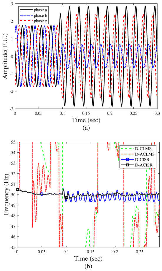 Finally, the real data from 110/20/10 kV substation is used to the frequency estimation, whose real frequency is still 50 Hz [11,12]. In Figure 13a, the real system initially has been in balanced condition for keeping 0.1s, and then an earth fault has occurred in phase , resulting in a 70% voltage drop for phase , with apart 50% and 30% voltage swells in phase and . In this experiment, the sampling frequency is set as 1000 Hz, and the initial frequency for each node is 50.5 Hz. Under the same impulsive noise with the above experiments, the tracking curves of the D-CISR, D-ACISR, and the existing algorithms are exhibited in Figure 13b. The proposed algorithms can effectively obtain system frequency before 0.1 s, and the D-ACISR algorithm converges steadily to 50 Hz within 0.03 s after a fault occurs, while the D-CISR algorithm has obvious oscillation as behavior. Thus, it is obviously seen that the proposed algorithms can provide stable frequency estimation, whereas there is a small error of 2 Hz in the experimental determination of the D-CISR algorithm.