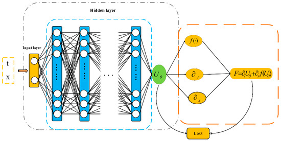 PINNs combine neural networks with the physical knowledge of PDEs. They incorporate the physical equations as constraints within the neural network, enabling the direct approximation of solutions to PDEs. Typically, PINNs establish the functional relationship between the input (where and represent the coordinates of time and space, respectively) and output (where represents the parameter weights and biases in the neural network) of neural networks by employing multi-hidden-layer fully connected neural networks and nonlinear activation functions. Employing automatic differentiation techniques, the partial derivatives of the output variables of the fully connected network with respect to the input variables are calculated to obtain the residual of the equation . Subsequently, the loss function is constructed using the residual of the equation. Taking the one-dimensional case as an example, the structure of the PINN is illustrated in Figure 1, and the residual of the equation is defined as follows: