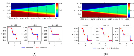 In the spatiotemporal plots of Figure 5, the variation of water depth at different positions and times, and the propagation and interaction of shock waves, sparse waves, and other wave phenomena, can be visualized. In (a), non-physical numerical oscillations can be observed near in the numerical simulation, resulting in shock waves and sparse waves that do not conform to actual physical behavior. In (b), after improvements, the propagation of shock waves and sparse waves is clearly visible, particularly at the edges, where the waves are not excessively affected by numerical dissipation. Since LSTM captures temporal dependencies and regularization prevents overfitting by reducing model complexity, the improved algorithm demonstrates accurate wave propagation capture. In the solutions at , it can be observed that the improved algorithm’s solution closely matches the reference solution, with no smoothing occurring at the corners of shock waves and sparse waves. The improved algorithm is more sensitive to capturing finer details.