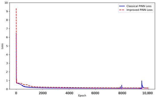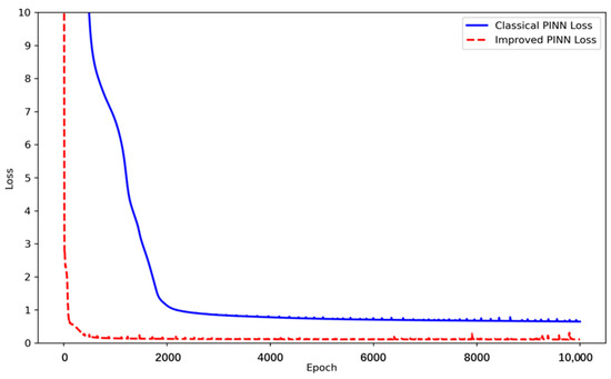 As shown clearly in Figure 9, the loss curve of the classical PINN exhibits several noticeable fluctuations and peaks after 8000 epochs of training, indicating potential instability in the later stages of training. In contrast, the loss curve of the improved PINN remains stable, with almost no similar fluctuations, demonstrating that the improved method is more stable during long-term training.