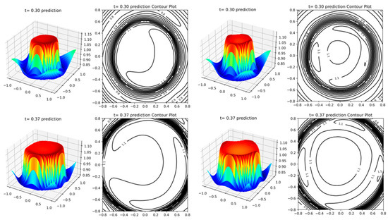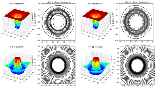 The computation is performed over the interval with , and gravity acceleration is taken as 0.98. The total water depth consists of outward-propagating sparse waves and inward-propagating shock waves. The classical PINN is set up similarly to Case 1, using seven hidden layers, each containing 64 neurons to construct a fully connected neural network. The Adam optimizer is used for 10,000 iterations, and after training, the solution across the entire time and spatial domain can be obtained. The improved algorithm incorporates two layers of LSTM and introduces an regularization term in the loss function. Each hidden layer also uses 64 neurons and the Tanh (hyperbolic tangent) activation function. Figure 7 and Figure 8, respectively, show the water depth surface plots and contour plots of the classical PINN and the improved PINN at and , and at and . The numerical results indicate that the improved algorithm exhibits good symmetry and overall consistency in the early stages. As time progresses, the initial symmetric structure is influenced by the nonlinear effects within the fluid, initial disturbances, and boundary conditions, making the fluid dynamics more complex. In the contour plots of the improved algorithm, some deviations appear in the finer details, revealing more intricate changes, which indicates an enhancement in capturing finer details.