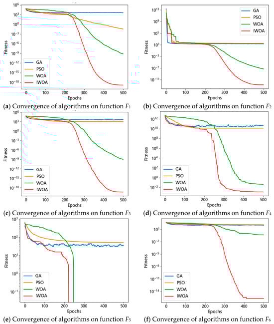 In Appendix A, Table A1: Each function has a dimension of 30, and the minimum value is 0. To ensure the fairness of the comparison, the iteration is set to 500. The crossover probability of GA is set to 1, and the variance probability is 0.1. Meanwhile, the learning factor c1 = c2 = 2 for PSO, and b is 10 for WOA. Each algorithm runs independently 30 times. The average and the best results are utilized for comparison, as shown in Table 2. The average convergence curve of each algorithm is shown in Figure 6.
