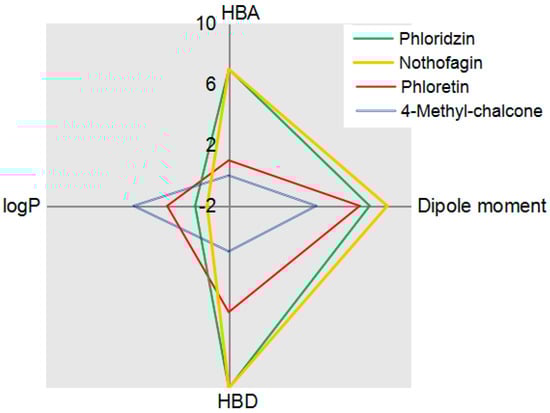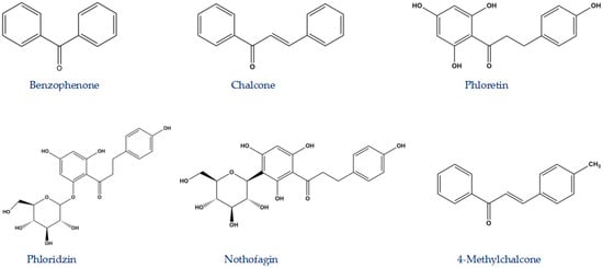 | Chalcone | −0.43 | −0.18 | −0.66 | −0.51 | −0.60 | −0.12 | 0 |