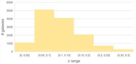 The redshift distribution of the galaxies. Since galaxies at higher redshift ranges tend to be smaller and dimmer, the number of annotated galaxies declines as the redshift range grows higher.