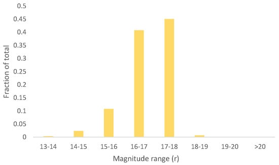 The magnitude distribution of the galaxies. The magnitude is the exponential magnitude of the r band. The vast majority of the galaxies have an exponential magnitude of 16–18.