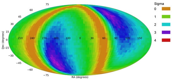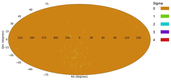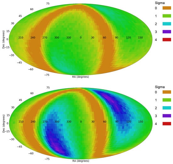 While the relatively small footprint does not allow us to identify the dipole axis with high accuracy, its location is still within the 1 error from the Galactic pole at approximately . When assigning the galaxies random spin directions instead of the observed spin directions, the maximum observed statistical significance drops to 0.51. This is expected as subtracting the of two sets of random values is not expected to generate a signal. A reproducible analysis when assigning the galaxies with random directions of rotation is also available at https://people.cs.ksu.edu/~lshamir/data/asymmetry_hsc (accessed on 15 October 2024). Figure 5 shows the probability of having a dipole axis by chance in different parts of the sky when the galaxies are assigned with random directions of rotation.
