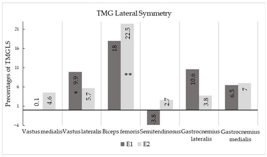 Table 3 also show the differences between the initial and final measurements, and a large significant effect and increase in symmetry percentages in the E1 group for three measured muscles, VL, BF, and GM (E1—9.9% (12.57), 18.0% (26.43), and 10.6% (13.08)), and in the E2 group, with the largest increase in symmetry percentages for only one muscle, BF (E2—22.5% (36.58)) at p < 0.05, respectively.