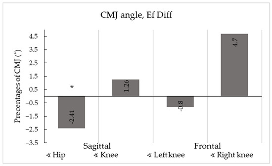 Also, differences between groups at the final measurement were only seen for the CMJ kinematic parameter from the sagittal point of view for the hip angle (E1—36.70 ± 9.46° to E2—45.20 ± 8.43°, p > 0.05).