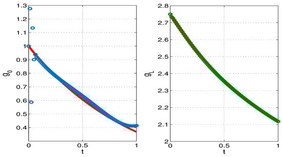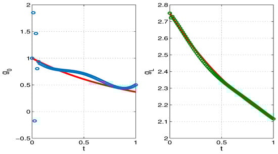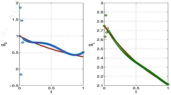 In Figure 1, we present the exact and recovered functions , for and and . In this case, the errors of the solution obtained by numerically solving IP3, compared with the discrete solution of the direct problem, are and . In Figure 2 we present determined boundary functions for and . Now, the corresponding errors are and