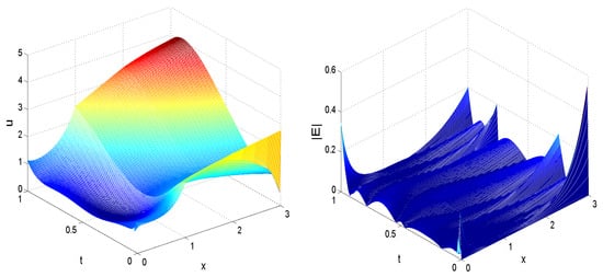Solution of the IP4 (left) and absolute error (right), , , , , , ; Example 3.