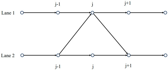 represents the driver’s sensitivity coefficient. In the Nagatani two-lane lattice model, Equation (1) represents the conservation equation, while Equation (2) denotes the vehicle motion equation.
