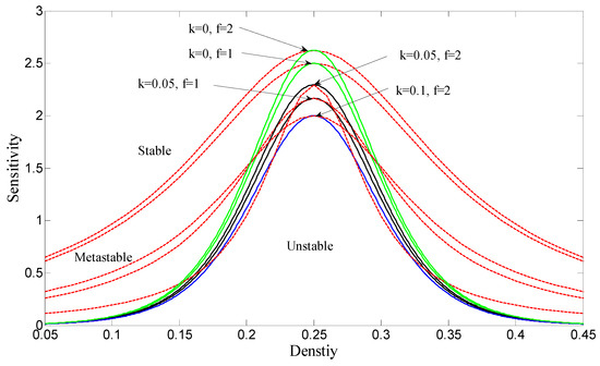 k = 0, indicating that the model does not yet incorporate the driver’s desire for smooth driving, only the aggressive lane-changing behavior of drivers influences the stability of the two-lane system. Under these conditions, the area of the hysteresis loop decreases as the value of