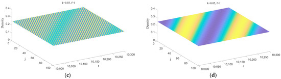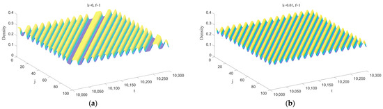 k = 0, the model degrades into the classic Nagatani two-lane lattice model. Since the desire effects of drivers’ smooth driving are not significantly considered at this point, disturbances gradually accumulate during propagation without being effectively suppressed, leading to the occurrence of stop-and-go traffic congestion. However, in subplots (b), (c), and (d), due to the notable incorporation of drivers’ desire for smooth driving, a remarkable contrast is observed compared to subplot (a), where traffic congestion is significantly alleviated, and traffic flow becomes smoother. Further observation reveals that as the parameter