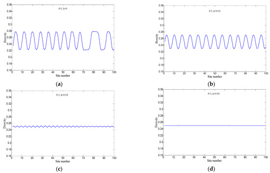 k increases, the fluctuation amplitude sharply decreases, gradually converging to the equilibrium state, and the frequency of transitions between the free-flow phase and the jammed phase also gradually decreases, resulting in smoother and more stable traffic flow. Especially in subplot (d), when the traffic density distribution reaches consistency across all lattice points, the traffic flow fully recovers to its initial steady state.