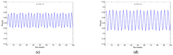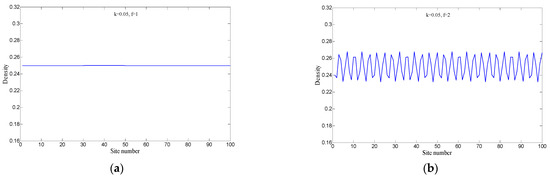 Based on Formula (8), we conducted numerical simulations on the two-lane system to verify the correctness of the above theoretical analysis. The simulations adopted periodic boundary conditions. The initial conditions are set as follows [