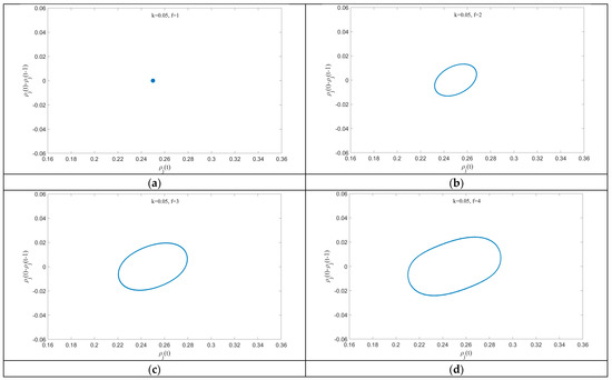 f = 1, 2, 3, 4 after 10,000 time steps of evolution in the new model, with the input parameters set at
