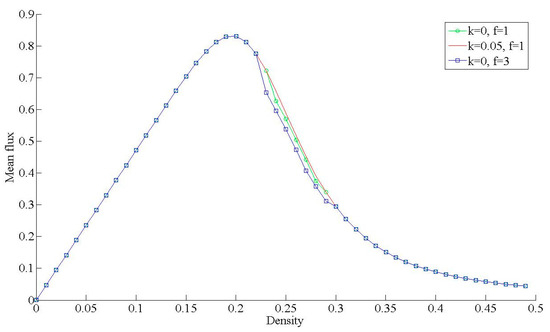 2], in which the effect of drivers’ smooth driving is not taken into account, and only their aggressive lane-changing behavior is at play. It can be observed that in the intermediate-density region, the mean traffic flux under these conditions is higher than that when