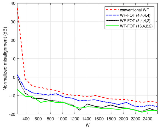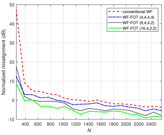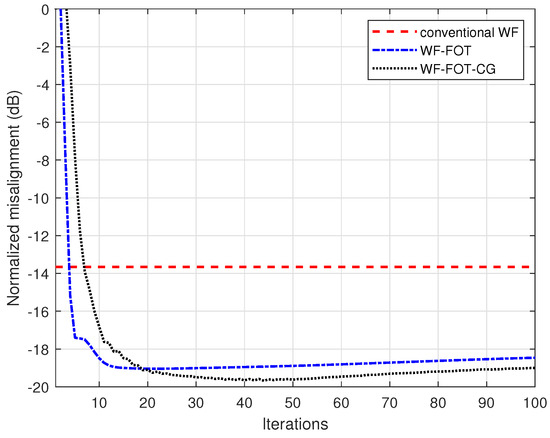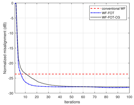 Normalized misalignment of the conventional WF, WF-FOT, and WF-FOT-CG. The FOT-based decomposition is performed using , , , and , with . The number of available data samples is , with , and dB.