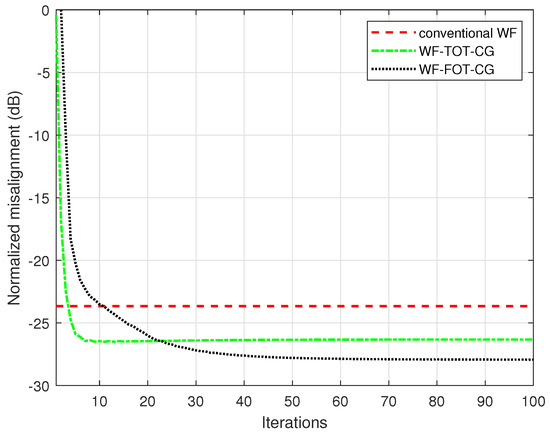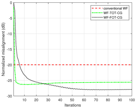 In Figure 3 and Figure 4, the SNR value is 20 dB and 10 dB, respectively. These represent good and moderate noisy conditions, respectively, so that the conventional WF should also perform well under these scenarios. Nevertheless, as supported in both cases, the FOT-based algorithms yield better performance with respect to the conventional WF from the point of view of the accuracy of the solutions, reaching smaller misalignments. The performance gain is more apparent for lower SNRs, like in Figure 4. While the WF-FOT and WF-FOT-CG perform very similar, the CG-based version is more efficient in terms of computational complexity. A slight increase/fluctuation of the misalignment after a certain number of iterations can be noticed in Figure 4, as compared to Figure 3. This behavior is consistent with the findings from our previous work [13], and it could appear especially in lower SNR conditions (e.g., dB in Figure 4, while dB in Figure 3).