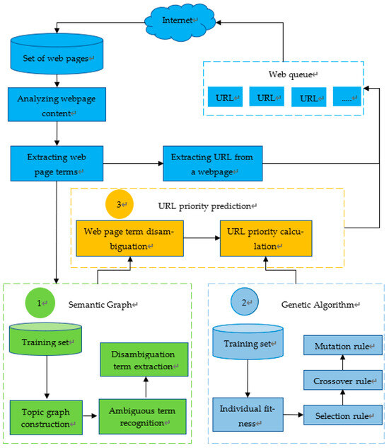 URL priority prediction utilizes semantic graphs and genetic algorithms to predict further the priority of each unvisited URL in web pages. First, the ambiguous terms are removed through the semantic graph to obtain accurate terms representing the web page. Second, the optimal weighting factors are acquired by the genetic algorithm to compute the priority of the URL. The URL priority prediction is divided into web page term disambiguation and URL priority calculation. The contents of the above two modules will be detailed below.