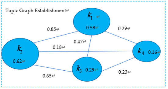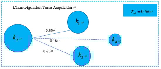 Figure 4 shows a specific example of disambiguation term acquisition. In Figure 4, is an ambiguous term, and the given disambiguation threshold is . The co-occurrence degrees between the ambiguous term and topic terms , , and are 0.85, 0.65, and 0.18, respectively. According to Equation (5), it can be determined that the disambiguation terms of the ambiguous term contain the topic terms and , but not .