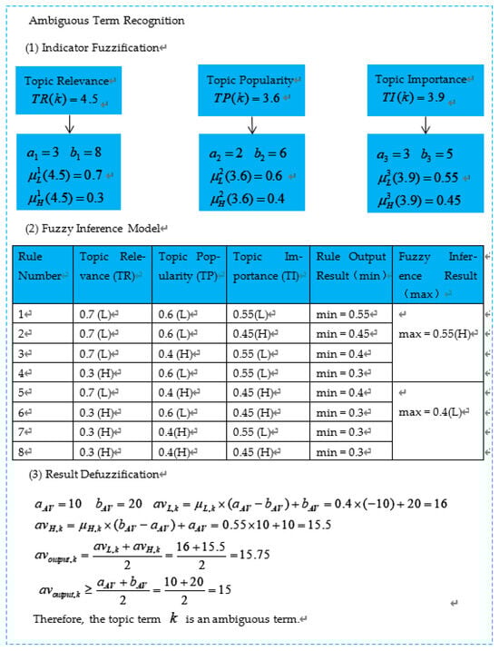 Figure 3 shows a specific example of ambiguous term recognition. In Figure 3, the three indicators of the topic term are 4.5, 3.6, and 3.9, respectively. The table combines Equations (2) and (3) to obtain inference results for two fuzzy sets “L” and “H”, i.e., and . The ambiguity threshold is the average value of the sum of the two parameters 15. According to Equation (4), it can be calculated that the ambiguity value of , , and the ambiguous value of the topic term is greater than the ambiguity threshold of 15, so the topic term is determined as an ambiguous term.