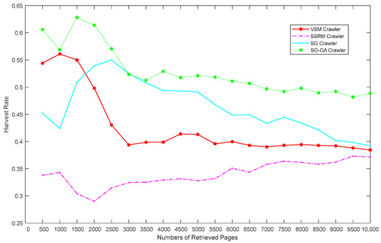 In this experiment, four different focused crawlers based on VSM, SSRM, SG, and SG-GA were designed, and the performance of the four topic crawlers was compared through the experimental results. The specific descriptions of the four focused crawlers are as follows: