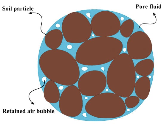 A porous medium is primarily described as a continuous medium, the properties of which are not expressed through the constituent elements but are described based on indicators averaged over a certain volume [14,15]. Soil is characterized by its moisture-holding capacity, i.e., the ability to retain a certain amount of moisture that does not flow into the underlying layers. The water regime of the soil depends on its properties, as well as climatic and weather conditions. The soil—the upper fertile layer of the earth’s surface, as well as the underlying soils—is a three-phase structure consisting of a solid phase, a liquid phase, and gas (air), as shown in Figure 1.