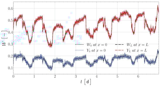 The results also show smooth behavior in the moisture distribution across the length of the container, despite the non-smooth nature of the experimental data. This indicates the model’s robustness and suggests potential improvements through future work with different experimental datasets. The analysis of the proportionality factor D over time and across different locations within the container reveals convergent behavior, further validating the accuracy of the calibrated model.