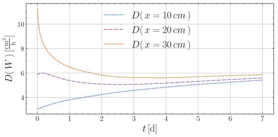 where is the coefficient of moisture conductivity, which, according to [12], follows the dependence . This coefficient also depends on the coordinates x, y, z, and W—volumetric soil moisture, H—pressure, and t—time.