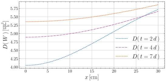 The minimization of the functional continued until the relative error between the numerical solution and the experimental data reached , which, in turn, shows a fairly satisfactory accuracy. Checking the absolute errors, , numerical results also meet our expectations. Figure 5 illustrates the changes in parameter D during a 7-day period at points , and . Despite non-smooth experimental data, the numerical results show smooth behavior, which should be investigated in future works with different data. Figure 6 demonstrates the distribution of parameter D along container lengths at times , and .