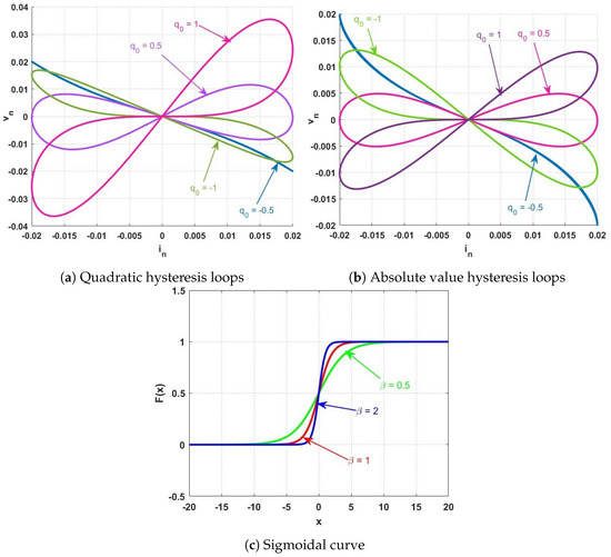The sigmoidal function is known to be capable of approaching −1 and 1, which changes an input into an output, especially since they are known for their distinctive nonlinear behavior and capacity to modify data. Moreover, quadratic and absolute value functions have been proposed by researchers utilizing differential modeling theories and , respectively. In [33,34], the dynamics of discrete-time integer-order system-based various functions were explored, which are known for their distinctive nonlinear behavior and capacity to change data, where the sigmoidal function is defined by . The S-shaped curve of the sigmoidal function and initial-relied pinched hysteresis loops of quadratic and absolute value maps illustrated in Figure 1 demonstrate the nonlinear sigmoidal function input values into a limited range, while other functions generate a hysteresis loop.