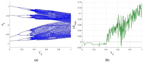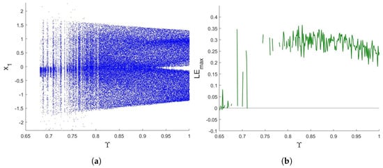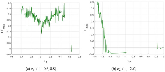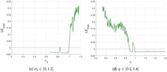 Now, Figure 4 portrays the bifurcation charts for the commensurate values when the controller parameters are , , , . We can see that the states of the three commensurate map-based functions (9) change the dynamics from periodic to totally chaotic and show a divergence in the motion of infinity in some points. Additionally, Figure 5 displays the that was computed with MATLAB R2024a code, confirming the outcomes of the bifurcation displayed in Figure 4. This indicates non-chaotic behavior, since the values are negative. In contrast, when the values are positive, the map displays a chaotic region. It is apparent that the behaviors of the three commensurate map-based functions (9) are influenced by the system factors, and variations in the commensurate derivative have an influence on the rich dynamics of the map (9).