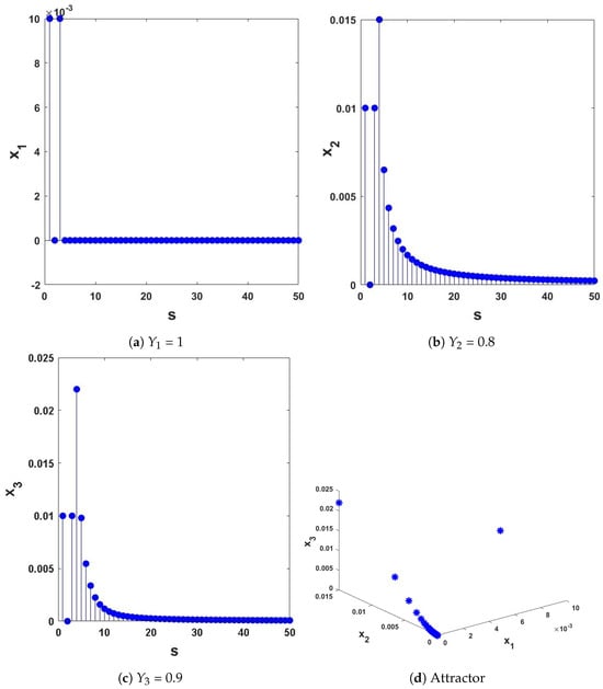 Clearly, from Equation (2) of (10), , replacing in Equatios (1) and (3), when the system (10), there are no (EP). Then, every attractor of the new fractional chaotic map-based three functions (9) are hidden and show asymmetry if , as displayed in Figure 2.