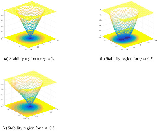 For other values of the fractional parameter , the stability regions are examined, as shown in Figure 1a–c.