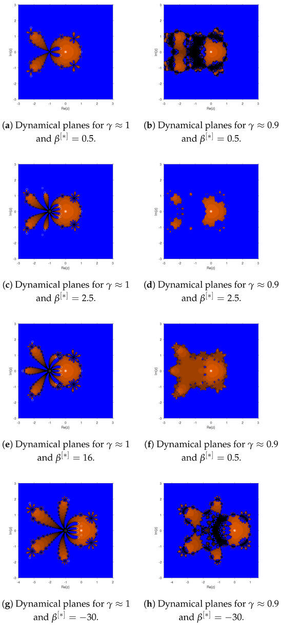 Dynamic planes offer insights into solution stability, convergence patterns, and behavior throughout the iterations. These planes reveal zones of attraction, where iterations converge, and regions of repulsion, where they diverge. They also highlight fixed points, cycles, and chaotic behavior, providing a deeper understanding of the methods’ sensitivity to initial conditions. This analysis is crucial for optimizing iterative methods and ensuring consistency in solving nonlinear equations. Similar to parametric planes, dynamic planes are generated to evaluate the stability of different schemes. Figure 3a–h shows the stable behavior of the schemes for various values of and Choosing values from the divergence zone of the parametric planes leads to unstable behavior, as illustrated in Figure 4a,c for different values.