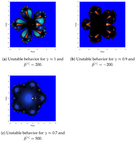 (a–c): Unstable dynamical behavior for various parameter values of the rational map .