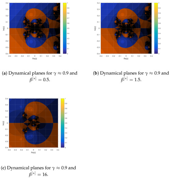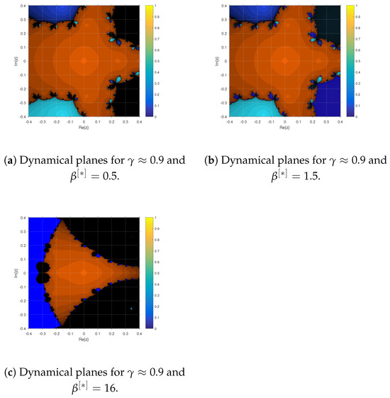 (a–c) Dynamical planes of the iterative technique for different values of while keeping fractional parameter for solving (61).