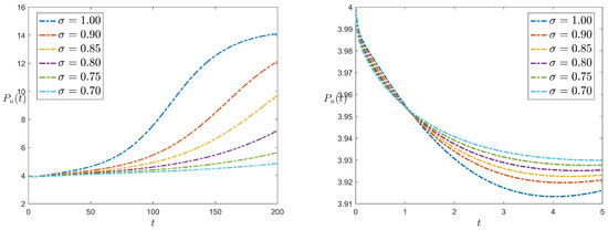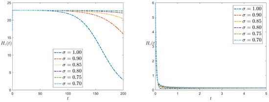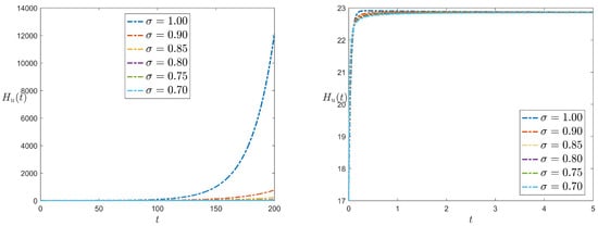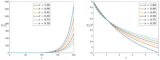 For the number of uncontaminated healthcare workers in this model with an initial value and different values of the parameter , with an increase in the value of sigma (if is large), the number of uncontaminated healthcare workers decreases rapidly, indicating that contamination occurs quickly as in Figure 6.