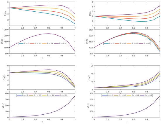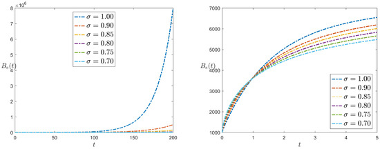 The solutions of free-living bacteria density in the environment as a function of time (t) with initial value () and with different values of the parameter are represented in Figure 8.