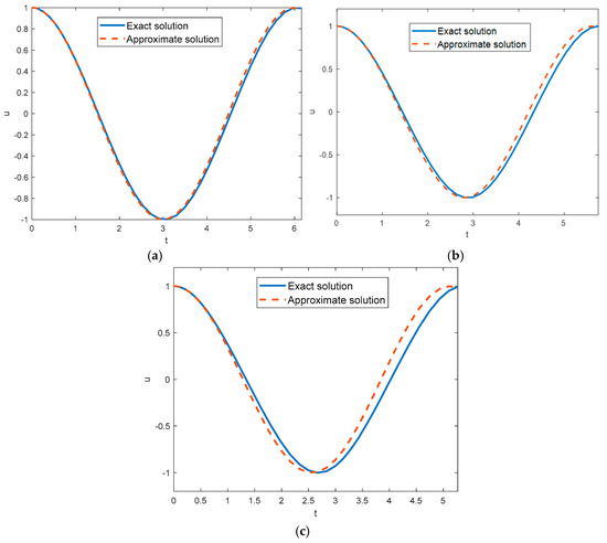 Comparison of the approximate solutions of Equation (29) with the exact ones for the cases of (a) A = 1, η = 0.1; (b) A = 1, η = 0.25; and (c) A = 1, η = 0.5.