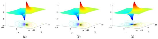 The 3D evolution and corresponding contour plots of three spatial variables over time in lump solution (22) are shown in Figure 2. At the same time, the peak valley points in the three spaces expressed in terms of , and , respectively.