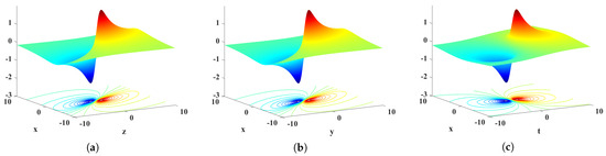 Figure 1 represents the 3D and corresponding contour evolutions for the lump wave (20) in x-t, y-t, and z-t spaces, respectively. By direct computation, it can be found that the extremum points of the three spaces are , and , respectively.