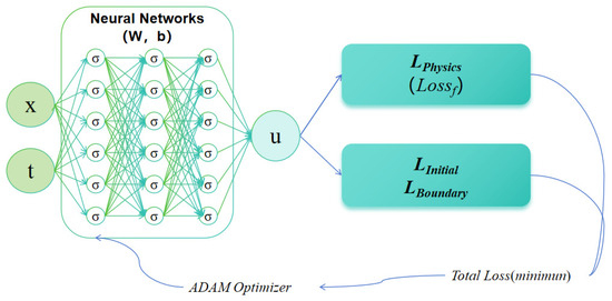 The schematic diagram for the PINN, which consists of an input, output, and a certain amount of hidden layers. denotes the action function, and the input to the NN passes through every hidden layer. The function u serves as the input to the loss function related to the initial, boundary, and physical information. The total loss function, including all these loss functions, minimized by the ADAM optimizer.