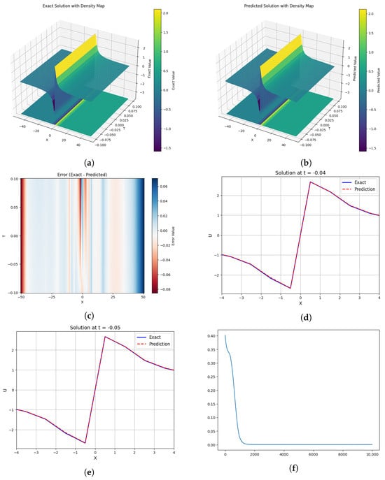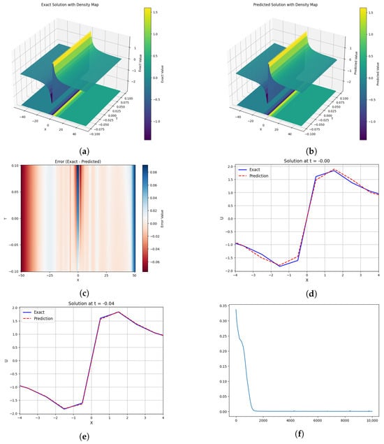 The 3D and corresponding density evolution plots for (a) the exact solution, and (b) the predicted solution; (c) The density evolution for the error between (a,b); The discrepancies between the exact and predicted results at (d) t = −0.04, and (e) t = −0.05; (f) The curve for the loss function.