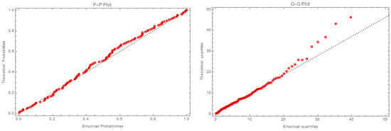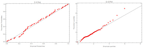 This dataset was utilized to obtain Pro-II C samples because of the K-S statistic and p-value for the modified Frechet-exponential distribution, calculated as K-S = and p-value = , indicating that the MFE distribution is appropriate for this dataset. In addition, the negative of the log-likelihood functions (), Akaike information criterion (AIC) [24], and Bayesian information criterion (BIC) were computed as follows: = , AIC = , and BIC = .